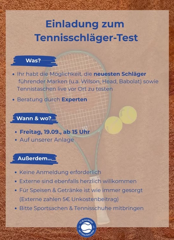 Erleben Sie einen Nachmittag voller Tennisspaß und Gemeinschaft beim Testen verschiedener Schlägermodelle mit professioneller Beratung. Nutzen Sie die Chance, neue Schläger auszuprobieren, sich auszutauschen und unsere Vereinsgemeinschaft zu stärken. Für Ihr leibliches Wohl ist mit leckeren Speisen und Getränken gesorgt.