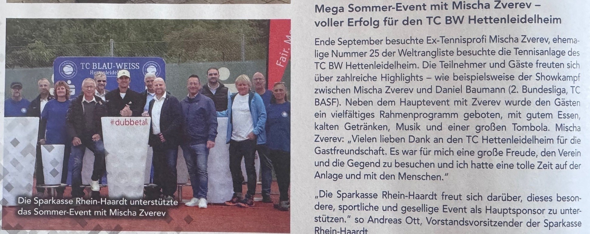 Zverev: „Vielen lieben Dank an den TC Hettenleidelheim für die Gastfreundschaft. Es war für mich eine große Freude, den Verein und die Gegend zu besuchen und ich hatte eine tolle Zeit auf der Anlage und mit den Menschen.“